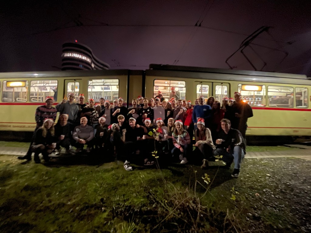 Im Winter wird’s dann gemütlich – und doch ziemlich ausgelassen! Bei unserem Weihnachtsfest steigen wir in unsere ganz besondere Partybahn, die für drei Stunden durch ganz Düsseldorf fährt. Ausgestattet mit reichlich Glühwein und Spekulatius, rollen wir quer durch die Stadt – vorbei an der Kö, über die Shadowstraße und durch weitere weihnachtlich beleuchtete Straßen. Dabei darf natürlich auch der Spaß nicht zu kurz kommen: Mit Teamspielen wie „Erkenne den Song“ wird’s garantiert nicht langweilig, und das ein oder andere kreative Weihnachtshighlight sorgt für Lacher und beste Stimmung. Ob Bachelor, Master oder bereits in der Promotion – hier kommt jeder ins Gespräch. Die lockere, festliche Atmosphäre macht es leicht, neue Kontakte zu knüpfen und alte Bekannte wiederzutreffen. Unser Weihnachtsfest ist damit nicht nur ein schöner Jahresabschluss, sondern auch ein Event, das den Zusammenhalt im Verein stärkt und zeigt, wie vielfältig und lebendig unsere Community ist.